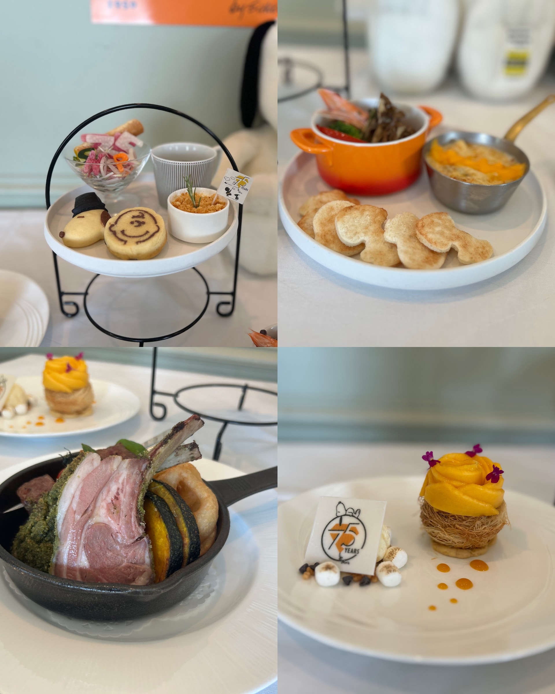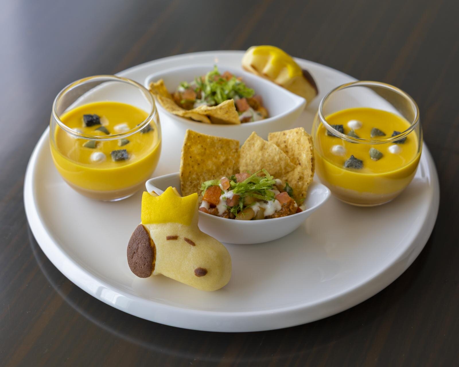 本館1階のオールデイダイニング「パークサイドダイナー」ではスペシャルメニュー「The Celebration Course ~HAPPINESS IS 75 YEARS OF PEANUTS~」では、前菜からメインなどコース仕立てで味わうことができる。