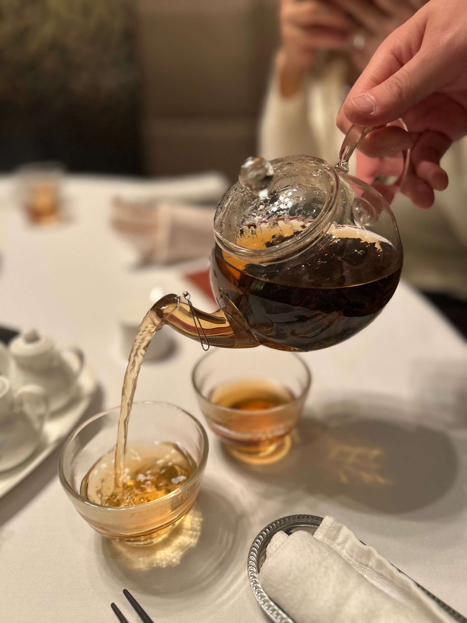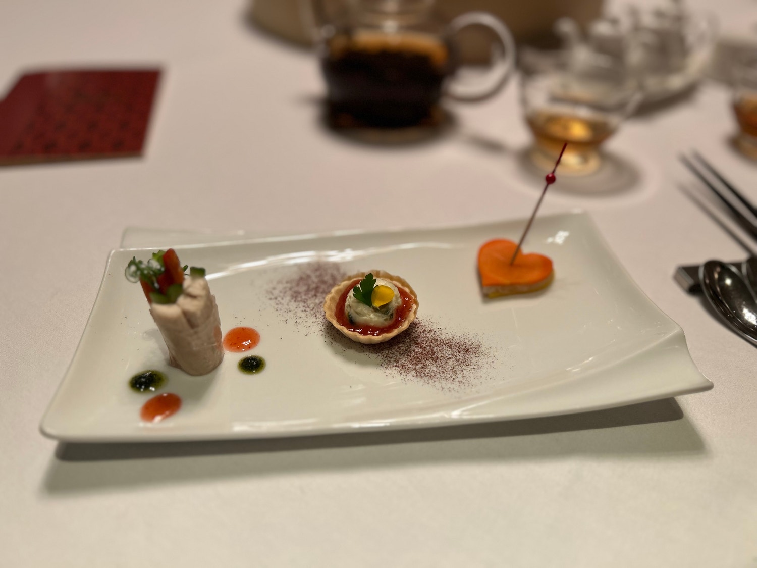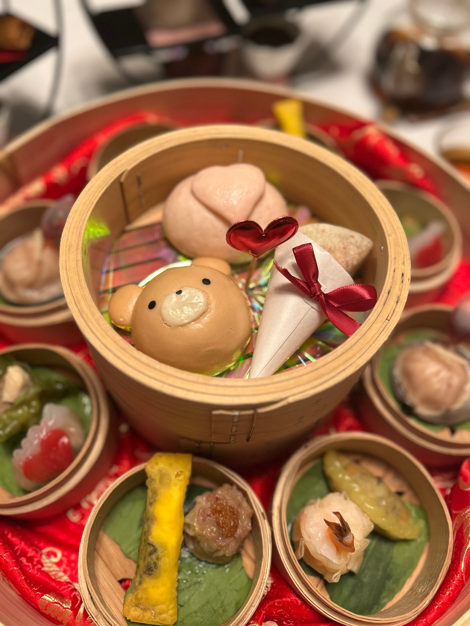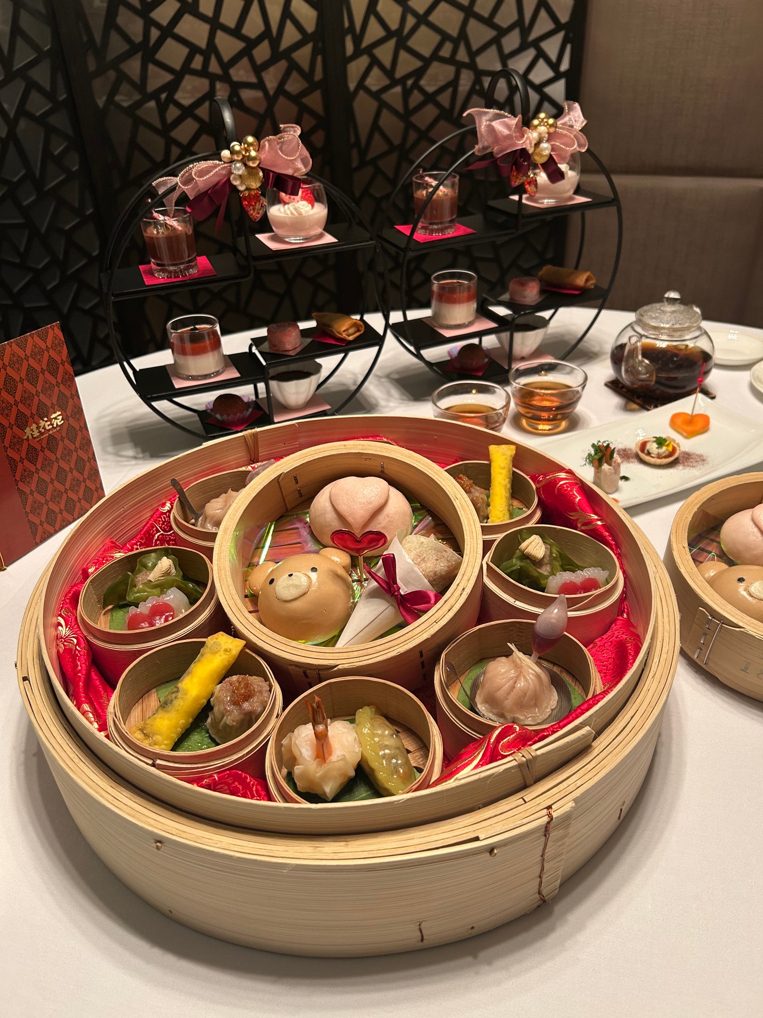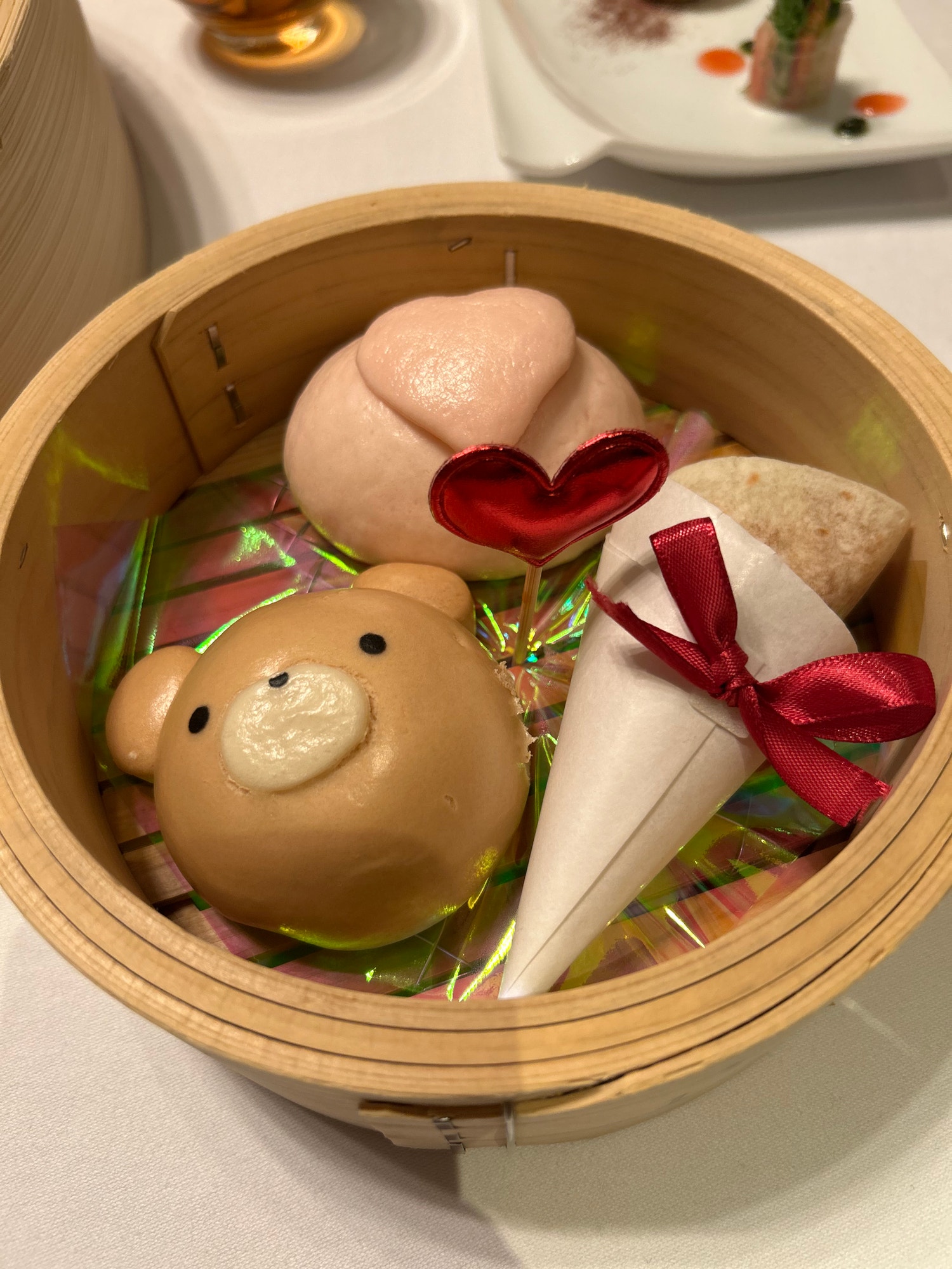 このチャイニーズアフタヌーンティーは、前菜の盛り合わせからはじまり、桃色のショーロンポー、ハートの蒸し餃子、きのこと野菜の蒸し餃子、かんざし海老の焼売などセイボリーが充実していて食べすすんでも飽きない。