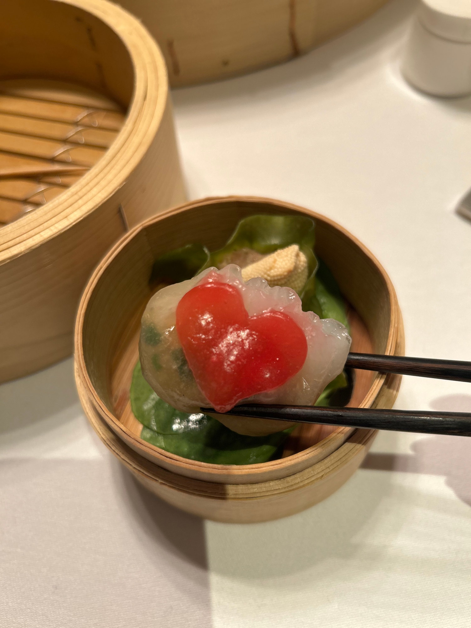 干し貝柱の旨みを閉じ込めて XO 醤をきかせた焼売や、ナッツの食感が楽しいハートをあしらった蒸し餃子、ピンクに染まる肉汁たっぷりの小籠包など、熟練のシェフが丁寧に仕上げる点心が彩を添えます。