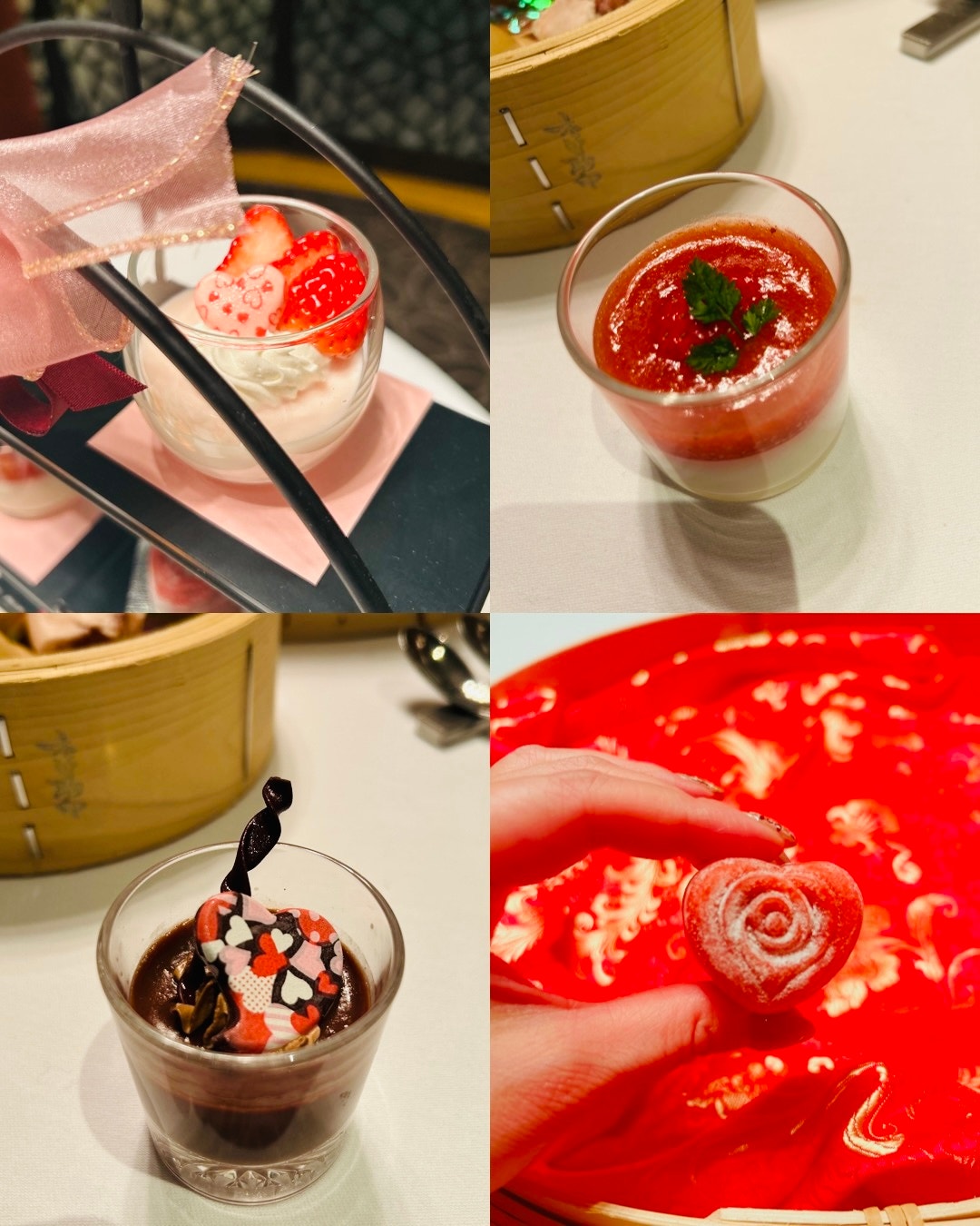 スタンドには、甘酸っぱいいちごのソースが爽やかな杏仁豆腐や、優しいピンク色のストロベリープリン、タピオカ入りココアミルクやチョコレートムースがまた、ハート型でバラの模様をあしらったストロベリー生月餅や、いちごとバナナ、チョコレートの甘い春巻きなど中国料理ならではのスィーツが揃います。