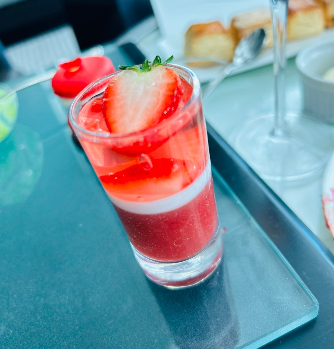 優しい甘みが特徴の新種の「とちあいか」を味わうゼリー。下からいちごゼリー、バニラパンナコッタ、いちごとエルダーフラワーのゼリーを重ね、味変が楽しい。