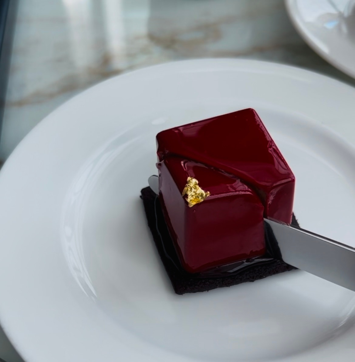ベトナム産チョコレートとラズベリーを合わせた濃厚な味わいの中に果実の瑞々しさを感じるなめらかなムース。宝石のようなチョコレートとラズベリーのムースは、カカオ75%のハイカカオとラズベリーのバランスが絶妙で素晴らしかった。